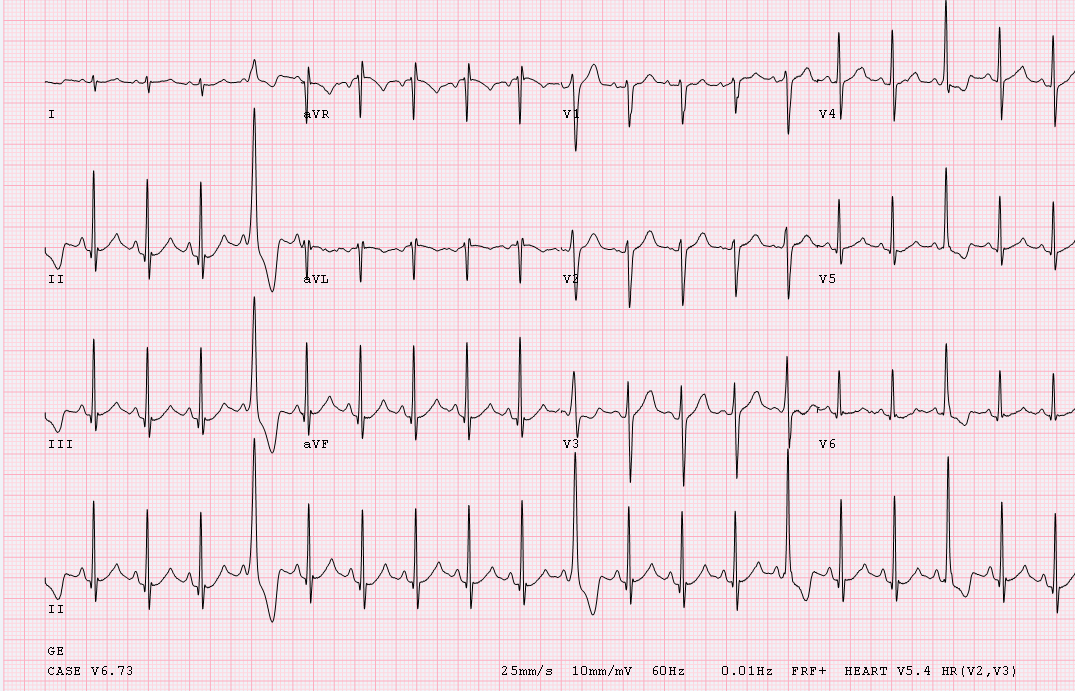 A 52-year-old male with a history of hypertension presents with exertional chest pain. He undergoes a treadmill stress test. Below is a snapshot from the ECG during exercise.How many PVCs do you...