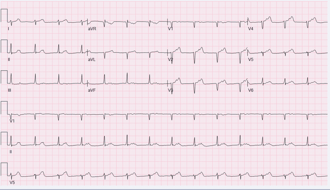 87-year-old male complains of dyspnea on exertion worsening over last 6 months, PND, orthopnea, and lower limb edema improved with diuretics. ECHO showed preserved LVEF, diastolic function not adequately assessed. ECG is shown below.