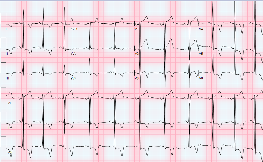 EKG on presentation is shown below. Initial high sensitivity troponin was 8 ng/L. Due to continuing chest pain, the patient was taken to the cardiac catheterization laboratory for diagnostic angiography and possible intervention.